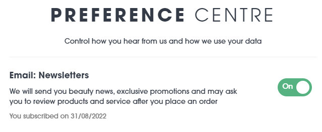 Control how you hear from us and how we use your data within your account via our Preference Centre. From there you can subscribe and unsubscribe from our Newsletter, opt in products reminders, onsite notifications and more. To access your Preference Centre please click here.