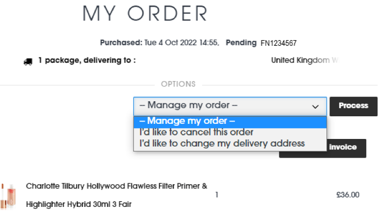 Providing your order is not in production in our distribution centre, you can:· Cancel your order· Change your delivery address
