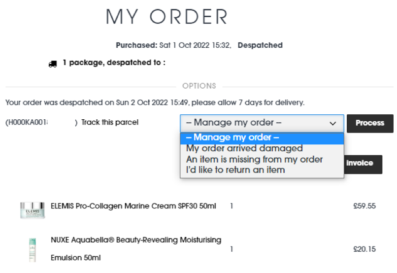Once your order has been despatched, you can:· Inform us of missing/lost orders and arrange a replacement· Advise us that an item arrived damaged and arrange a replacement (please also email a photo of your damaged / faulty item to care@sephora.co.uk)· Inform us of missing items from orders and arrange a replacement· Inform us of a return
